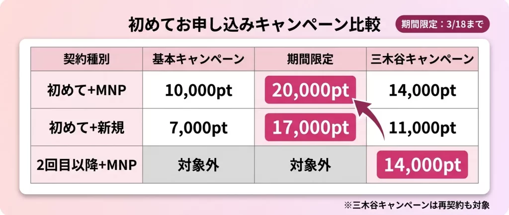 | 初めてお申し込み+期間限定 | 最大20,000pt還元 |