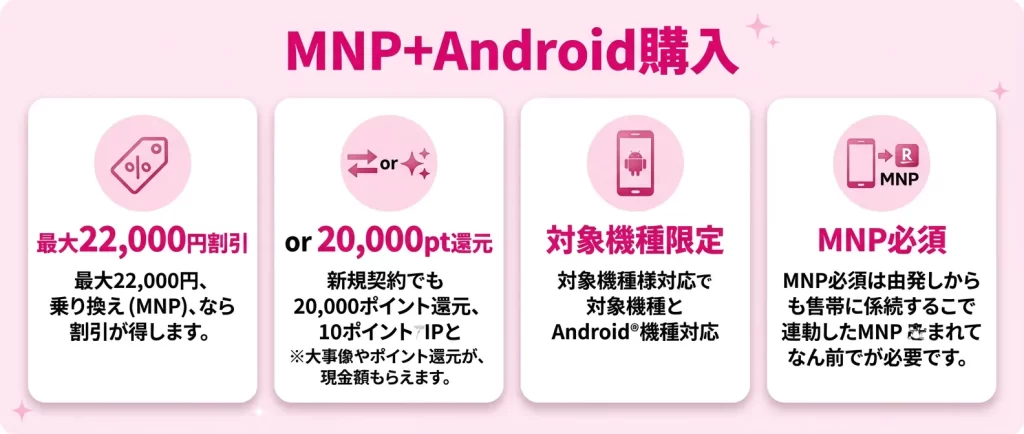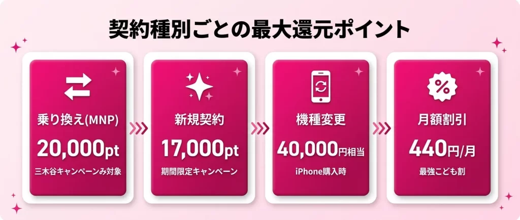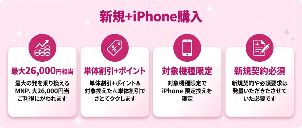 2026年3月現在、MNP乗り換えで最大20,000ポイント還元、iPhone購入で最大40,000円相当還元など、見逃せない特典が豊富に揃っています。