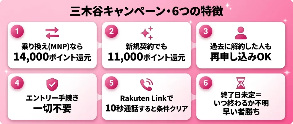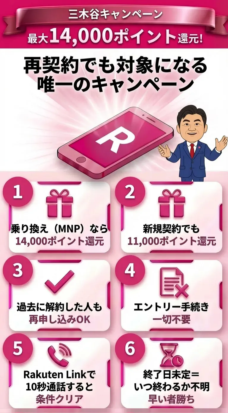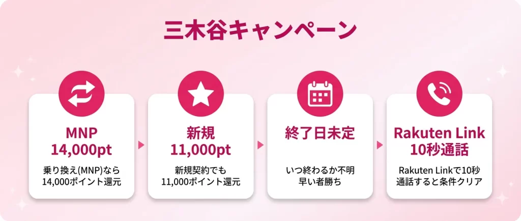 - SIMのみMNP乗り換え:三木谷キャンペーンで最大14,000ポイント還元