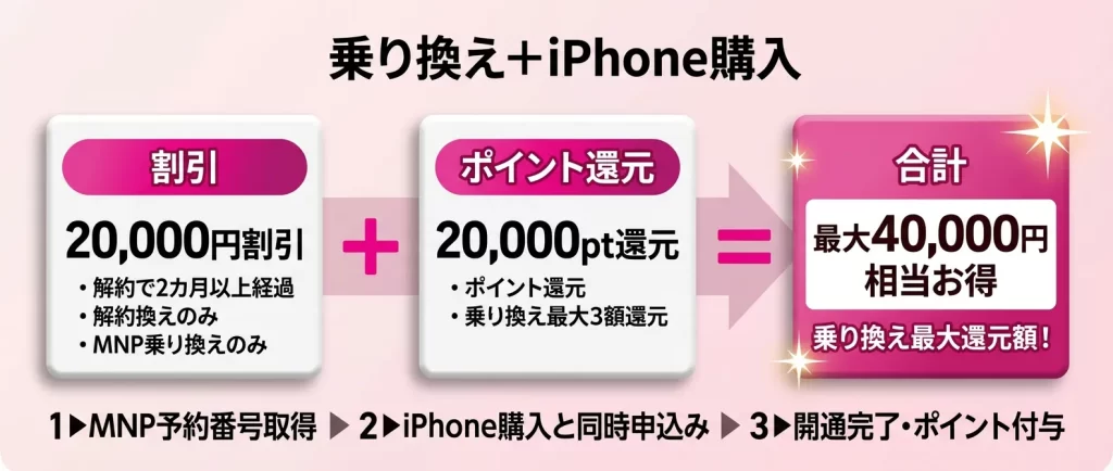 | MNP+iPhone購入 | 最大40,000円相当お得 |