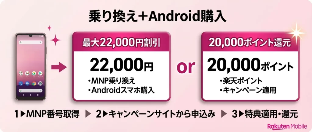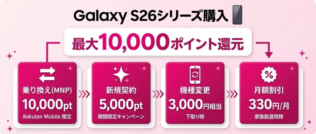 - 楽天モバイルに初めてお申し込み+MNP乗り換え:最大26,000pt