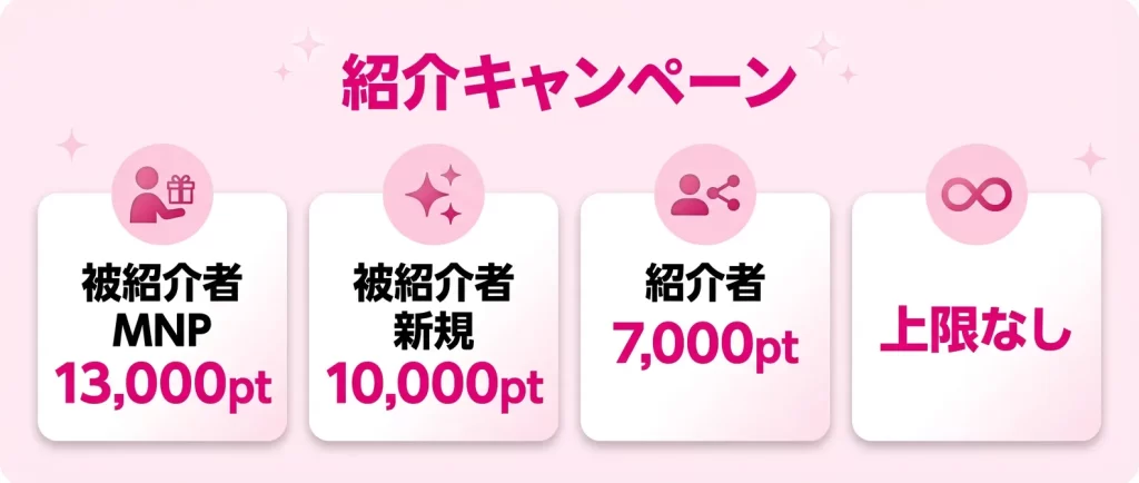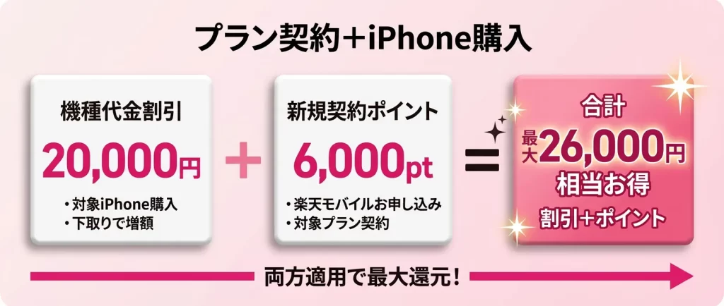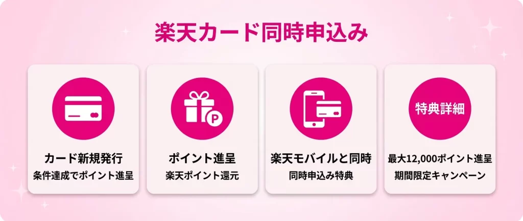 | 2025年11月〜12月、2026年3〜4月 | 楽天マジ得フェスティバル | 楽天カード会員×楽天モバイル初回申込で20,000pt還元。第2回は3/19〜4/13開催 |