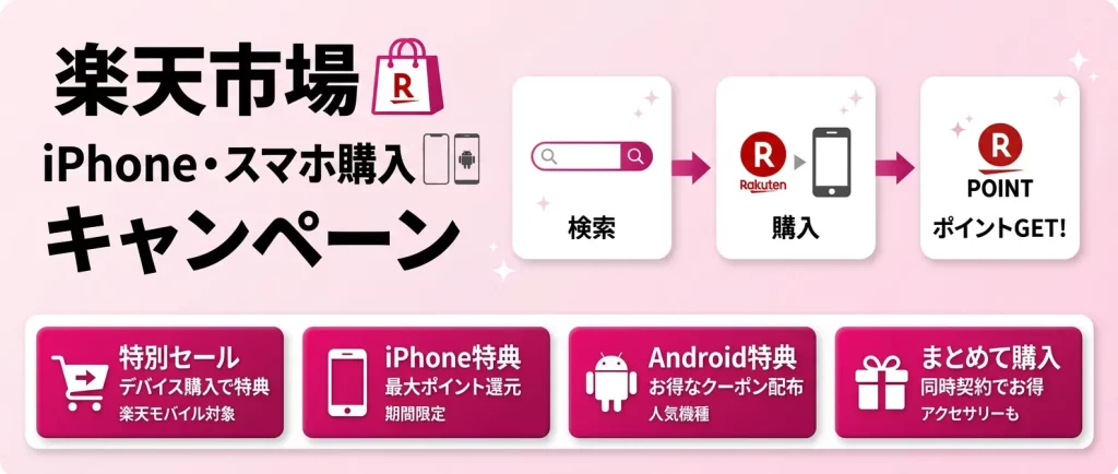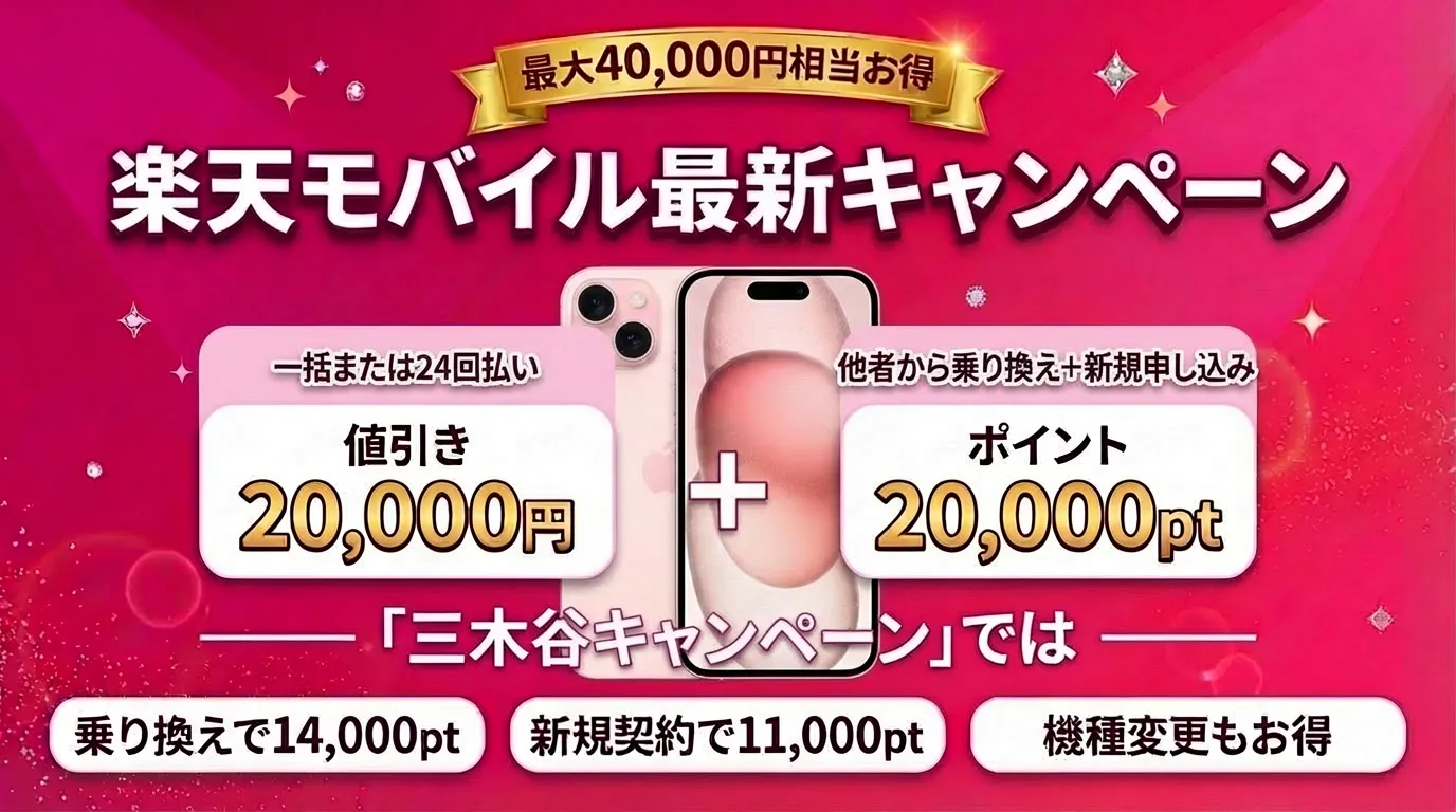 2026年4月時点の楽天モバイル最新キャンペーンを比較し、新規契約・乗り換え(MNP)でおすすめのキャンペーンを紹介します。現在は楽天モバイル最強感謝祭(4月1日〜4月27日・総額2億円相当還元)を開催中です。加えて4月13日までは楽天カード会員向け「マジ得フェスティバル」で20,000ポイント還元も実施中。最新のiPhone17シリーズ(最大36,000円相当がお得)や人気Androidスマホがお得に購入できるキャンペーンが豊富なので、ぜひ参考にしてください。