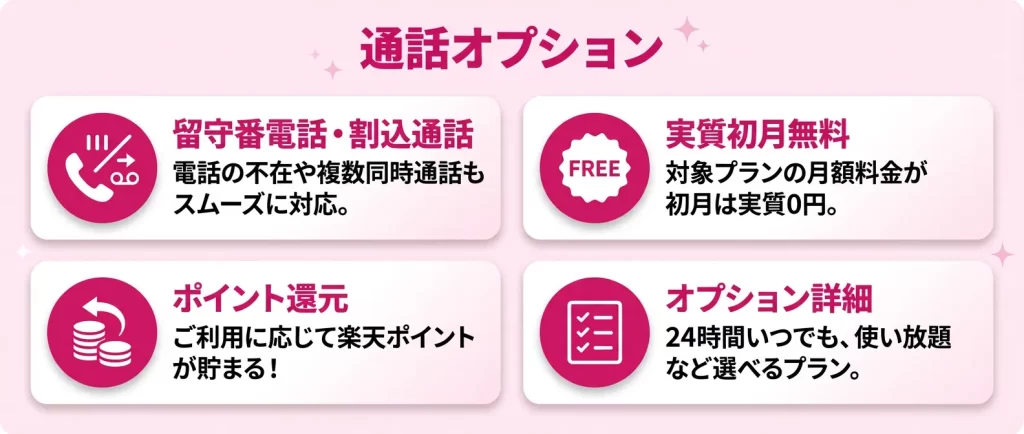 - 国内通話:Rakuten Linkアプリで無料(一部対象外番号あり)