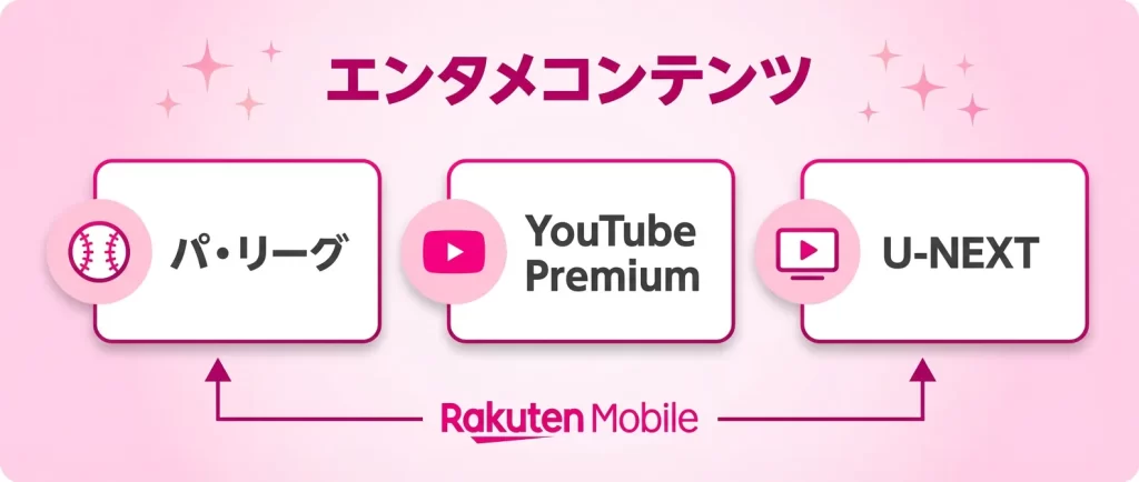 楽天モバイル契約者は、追加料金0円で楽しめるエンタメコンテンツや、お得に利用できる動画サービスが充実しています。