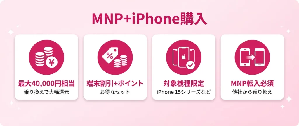 - iPhone購入+MNP:最大40,000円相当還元(iPhone 15シリーズ)