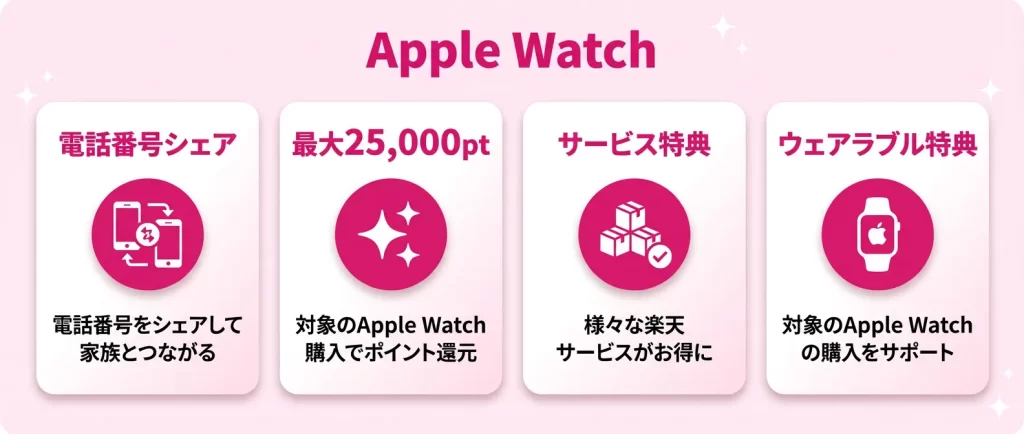 Apple Watchの購入を検討している方は、楽天モバイルの電話番号シェアサービスとあわせて申し込むとポイントがもらえます。対象のApple Watchを購入し「電話番号シェアサービス」に加入すると、最大25,000ポイントの進呈を受けられます。