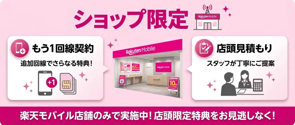 楽天モバイルショップ(実店舗)で申し込むと、Web申込にはない追加のポイント還元が受けられるキャンペーンが実施されています。